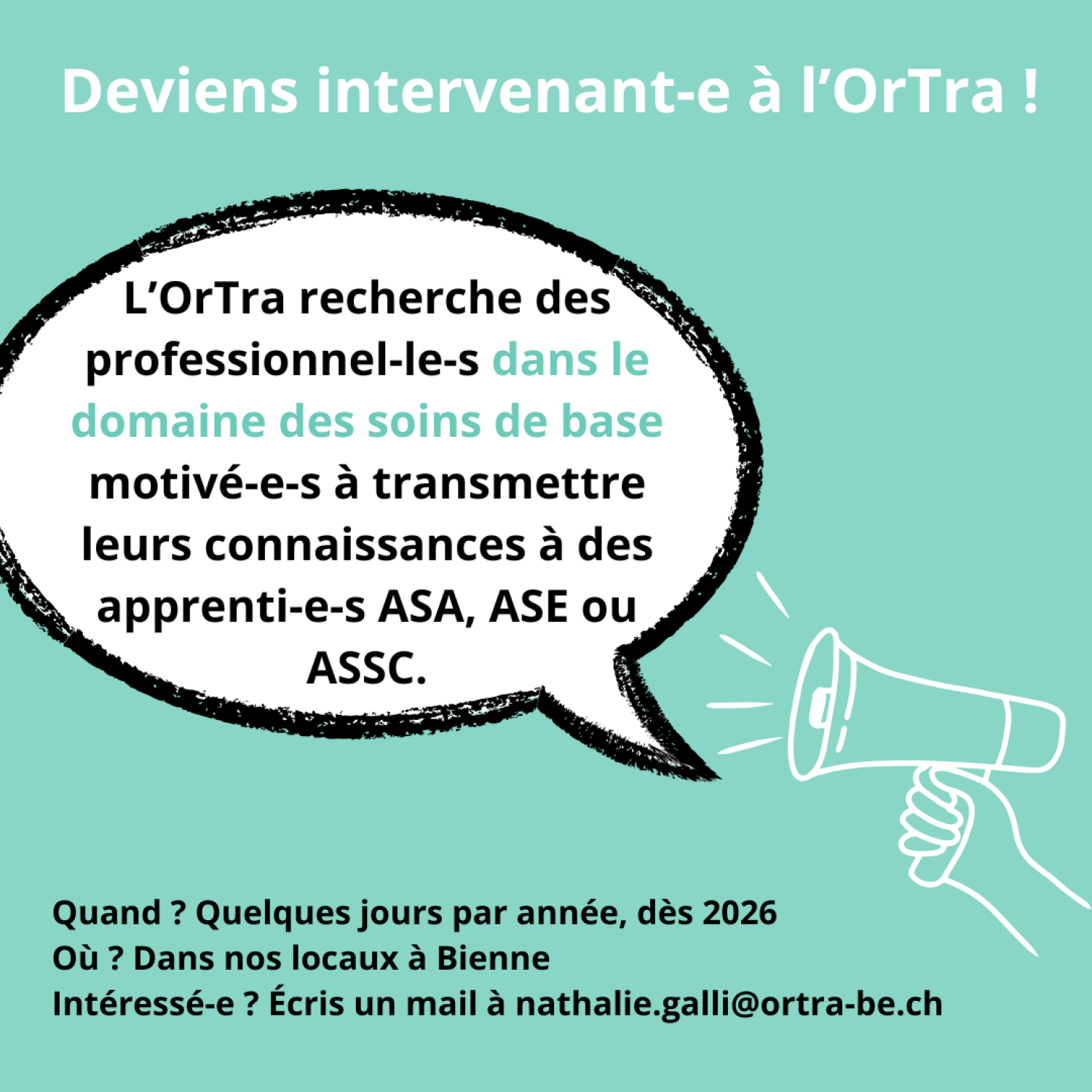 Plus d'infos et inscription : nathalie.galli@ortra-be.ch